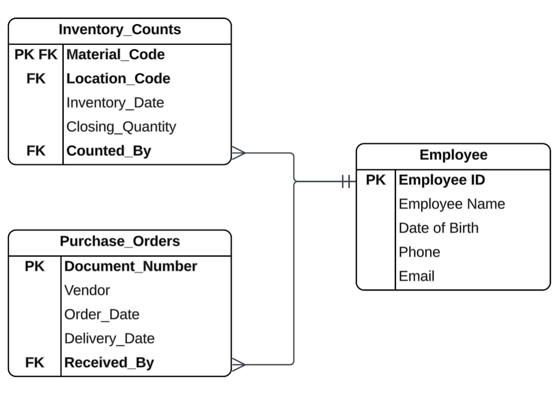 First, in Inventory_Counts entity, we can add a new required FK Counted_By that references the PK of the Employee entity - Employee_ID. This would make a required one-to-many relationship between Employee and Inventory_Counts, which would allow us to track which employee is responsible for each inventory count. The Inventory_Counts entity clearly lables the material, quantity, and date of the inventory count. So, when employees sign their name to the inventory count, they are confirming that they have verified the material, quantity, and date of the inventory count, which would enhance accountability.